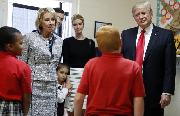 美国总统川普与新上任不久的教育部长访问佛州奥兰多市的一所天主教私立学校。